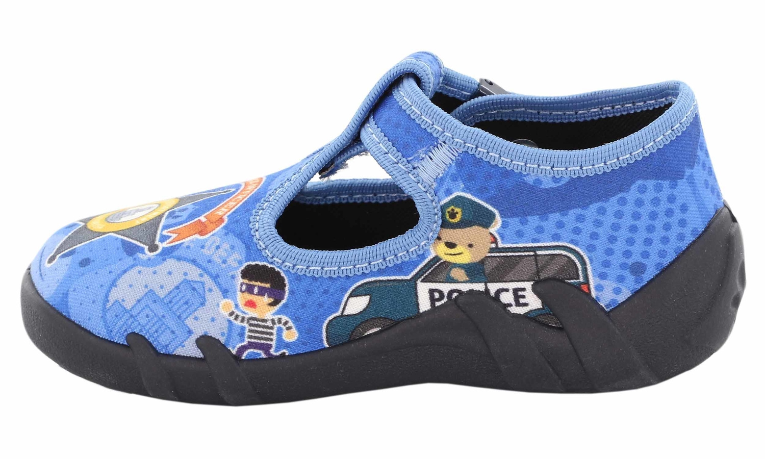 RENBUT sklep - Obuwie dziecięce tekstylne, kapcie przedszkolne, profilaktyczne wykonane z naturalnej bawełny. Wkładka wewnętrzna profilowana, antybakteryjna, zawiera jony srebra, wykonana z naturalnej skóry i pianki lateksowej zawierającej aktywny węgiel drzewny absorbujący pot i zapachy. Podeszwa profilowana, oddychająca (system wentylacji) wykonana z elastycznego i lekkiego tworzywa PVC doskonale przenosi obciążenia na podłoże i amortyzuje wstrząsy. Usztywniona cholewka stabilizuje stopę. Regulowane zapięcie na zapinki pozwala precyzyjnie dopasować obuwie do różnych kształtów stopy. Obuwie pod względem konstrukcyjnym, technologicznym i materiałowym spełnia wymogi certyfikatu "Zdrowa Stopa" przyznawanego przez IPS w Krakowie i zostało wyróżnione przez specjalistów znakiem "Żółtej Stopy" jako idealne w profilaktyce kształtowania prawidłowego rozwoju, funkcjonowania i budowy stopy dziecka.