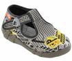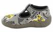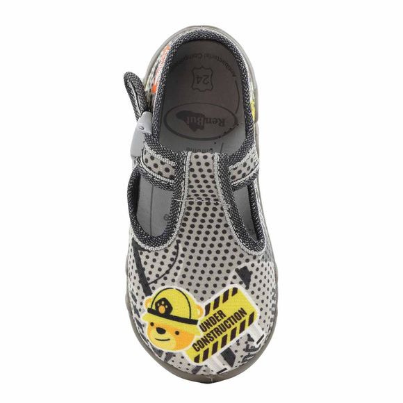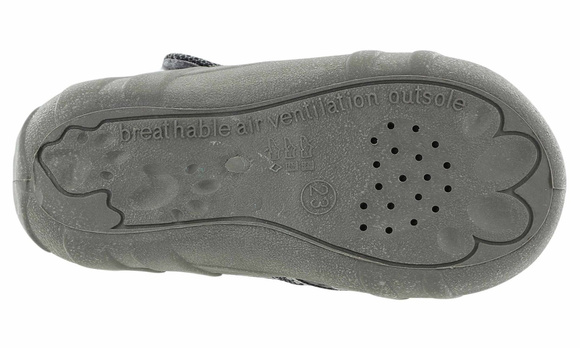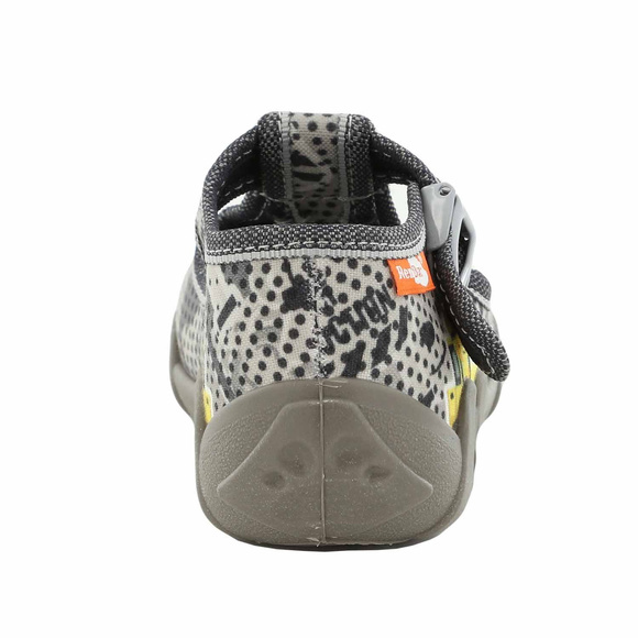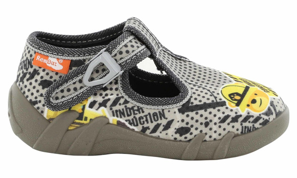 RENBUT sklep - Obuwie dziecięce tekstylne, kapcie przedszkolne, profilaktyczne wykonane z naturalnej bawełny. Wkładka wewnętrzna profilowana, antybakteryjna, zawiera jony srebra, wykonana z naturalnej skóry i pianki lateksowej zawierającej aktywny węgiel drzewny absorbujący pot i zapachy. Podeszwa profilowana, oddychająca (system wentylacji) wykonana z elastycznego i lekkiego tworzywa PVC doskonale przenosi obciążenia na podłoże i amortyzuje wstrząsy. Usztywniona cholewka stabilizuje stopę. Regulowane zapięcie na zapinki pozwala precyzyjnie dopasować obuwie do różnych kształtów stopy. Obuwie pod względem konstrukcyjnym, technologicznym i materiałowym spełnia wymogi certyfikatu "Zdrowa Stopa" przyznawanego przez IPS w Krakowie i zostało wyróżnione przez specjalistów znakiem "Żółtej Stopy" jako idealne w profilaktyce kształtowania prawidłowego rozwoju, funkcjonowania i budowy stopy dziecka.